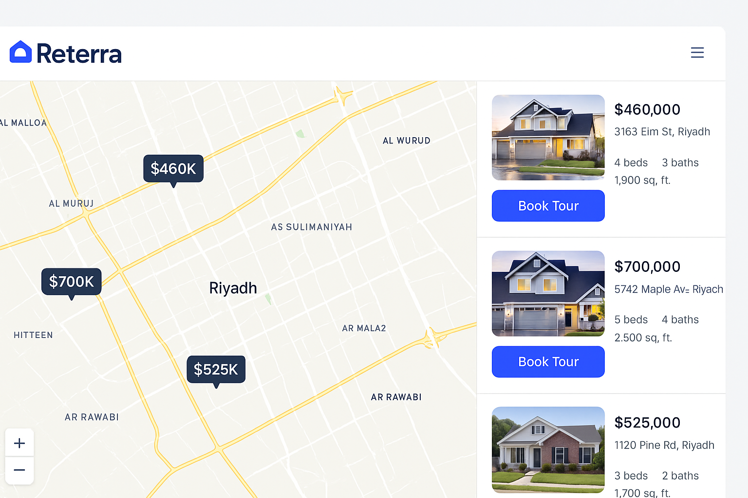 في ريتيرا نجعل البحث عن منزلٍ جديد تجربة بسيطة وواضحة. نربطك بقوائم موثَّقة، ونمنحك أدوات ذكية للمقارنة وحجز المعاينات فورًا، ثم نكمل الرحلة معك حتى توقيع العقد رقمياً. سواء كنت مشتريًا يبحث عن السعر المناسب، أو مالكًا يريد تسويق عقاره باحترافية، ستجد في منصّتنا بيانات لحظية، دعمًا متجاوبًا، وواجهة عربية سهلة تساعدك على اتخاذ قرارٍ واثق بسرعة وشفافية.