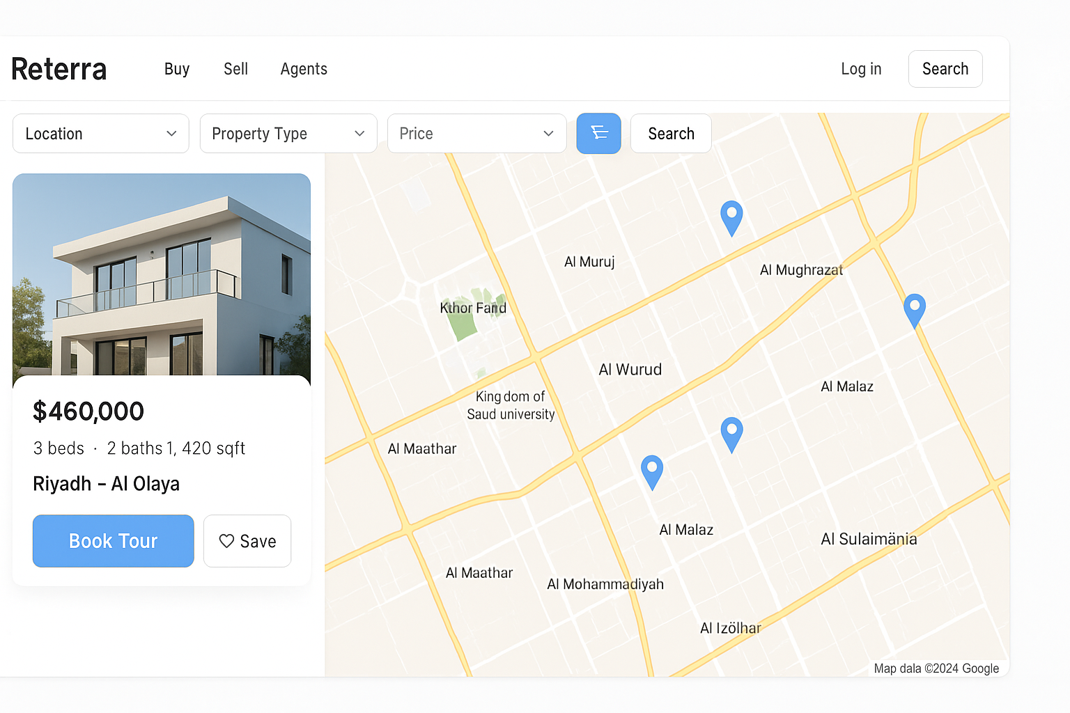 قارن الأحياء، احجز المعاينات فورًا، وقدّم عروضًا رقمية آمنة عبر ريتيرا.